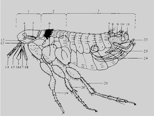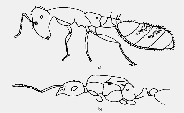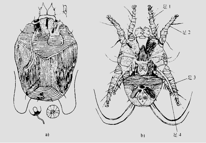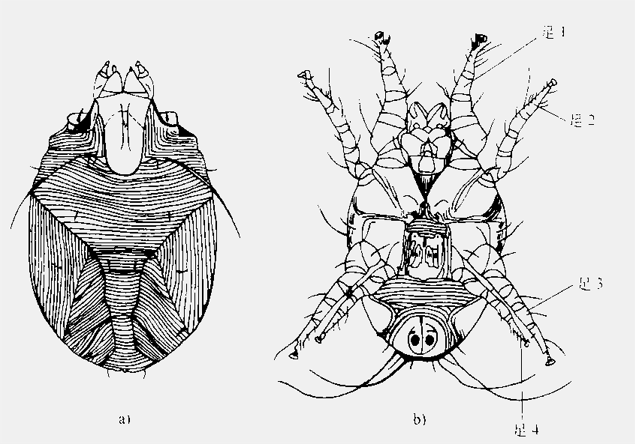 (1)跳蚤的形態特征 蚤(fleas),俗稱跳蚤,隸屬于昆蟲綱、蚤目(siphonaptera)。成蟲體小,一般長3mm,體形左右側扁,棕黃以至深棕色,體壁堅硬,體分頭、胸、腹3部分,無翅,有3對足,尤以第3對足最為發達。如圖6—1所示。 圖6—1跳蚤外部形態 1-頭部 2胸部 3-腹部 4-眼 5-觸角 6-前胸櫛 7-臀前鬃 8-臀板 9-上抱器 10-抱器突起 11-抱器可動突 12-眼鬃 13-口剛毛 14-下顆須 15-內唇16-下顎內葉 17-下鄂葉 18-下唇須 19-前足 20-中足 21-后足 22-下抱器23-抱器柄狀突 24-陰莖 1)頭部。略呈三角形,有觸角l對,位于觸角溝內,是重要的嗅覺器官,觸角分為3節,末節膨大,又分9個假節。眼位于觸角溝前方,視覺能力有限,僅分辨明暗,有些蚤種眼部退化或消失眼前常有1根稱為眼鬃的硬毛,其位置常具分類意義。頰部有若干粗壯的棕褐色扁刺排列成梳的頰櫛,其有無及其排列方式、刺數和刺形在分類中頗為重要。口器為刺吸式,位于頭的前下角,由1內唇與1對下顎內葉組成,是主要的刺吸器官,并附有下顎葉、下顎須和下唇須各1對。 2)胸部。分前、中、后胸3節,與跳躍功能相聯系,后胸尤其發達。每一胸節由背板、腹板及側板組成,腹板與側板愈合為一(僅留痕跡),稱作腹側板。許多種類前胸處常有前胸櫛,櫛刺數目、形狀和排列都有重要的分類意義。胸部還具分類意義的是中胸腹側板,某些種類的中胸腹側板可有1~2個幾丁質角質厚桿。各胸節有足1對,各足的構造基本相同,自基部起依次為基、轉、股、脛、跗,跗節亦復分5節,末節具爪1對。 3)腹部。共10節,前7節形狀變化不大,稱正常腹節,各腹節通常都有一塊背板和一塊腹板組成,兩者均有節間膜連接。某些蚤種的雌性的節間膜十分發達,以至當懷卵成熟時,腹部借節問膜而充分膨大。 蚤類的腹部自第8節之后,稱為變形腹節或生殖節,雄性蚤的該腹節高度變形,演化成上、下抱握器各1對。其外生殖器被認為是動物界中最復雜的構造,具有分類上的重要意義。 (2)塵螨的形態特征 塵螨在分類上隸屬于真螨目,蚍螨科(Pyroglyphidae)。與人類疾病有關的塵螨有3種,為屋塵螨。 1)屋塵螨。雌螨大小(長X寬)一般為(290~380μm)×(220~260μm),體形較扁長,后背中央皮紋縱行;足4對,各足分5節;足4短小,足3粗長;交合囊小,受精囊呈花瓣狀。雄螨大小(長×寬)一般為(240~280μm)×(155~220 μm);后盾板長大于寬;足1與足2等粗,基節1內突不相接,無胸骨。如圖6—2所示。 圖6一2屋 a)雌螨 b)雄螨 2)粉塵螨(Dermatophagoides Iarinae)。雌螨大小(長×寬)一般為(370~440 μm)×(235~330 μm),體型飽滿,后背中央皮紋橫行,末端拱形;足3與足4等粗,細長;交合囊大,角質深,受精囊退化。雄螨大小(長×寬)一般為(285~360 μm)×(200~245μm),后盾板寬短,足1特別粗壯,基節1內凸相接成胸骨。如圖6—3所示。 圖6-3 粉塵螨 a)雌螨 b)雄螨 3)埋內歐塵螨(Euroglyphus maynei)。埋內歐塵螨大小(長×寬)一般為(200~290μm)×(100~160μm),體型前端呈三角形,后緣較方,中央有明顯的淺內陷,角皮皮紋粗皺;體毛都較微小,僅雄螨尾端有一對中等長的毛。雌螨后體背面有一長方形的角化區,雄螨有卵圓形的后盾板。 (3)小黃家蟻的形態特征 螞蟻屬膜翅目(Hymenoptera)細腰亞科(Apocrita)針尾類(Aculeata)蟻總科(Formicoidea)蟻科(Formicidae)。生活中常見的螞蟻即為小黃家蟻,小黃家蟻(Monomorium Pharaonis Linnaeus)屬切葉蟻亞科(Myrmicinae)小家蟻屬(Monomorium Mayr),又叫法老蟻(Pharaoh’s ant)、廚蟻,為熱帶和亞熱帶螞蟻。小黃螞蟻主要有工蟻、雌蟻和雄蟻,工蟻主要負責建筑巢穴,運輸、儲存糧食以及培育幼小螞蟻等;雌蟻和雄蟻主要負責繁衍后代。 1)工蟻。 體長2.2~2.4 mm。體淺黃色至淺黃褐色,有時帶紅色;第1結節兩側和后緣及后腹部顏色較深;后腹部上總可見一深色暗斑。頭背面有3~4對立毛;后頭緣有1對毛,靠近后頭角,極少數另有1對更短的毛存在;并胸腹節背板無毛或有時僅具1短毛;第l結節有1~2對毛,第2結節有2~3對毛;后腹部毛豐富,上顎具弱的縱向刻紋;頭背面和并胸腹均具細小的網狀刻點;后腹部背板僅具網狀痕跡。頭側緣略凸,后頭緣略凸或平;復眼小,為頭寬的0.81~0.21倍;唇基前緣中央凹陷(見圖6 4)。前、中胸背板凸,其末端陡,與并胸腹節背板間形成一溝。 圖6—4小黃家蟻 a)工蟻側面 b)雌蟻側面 2)雌蟻。雌蟻體較工蟻大,有的大出數倍。顏色與工蟻同。頭寬通常與中胸盾片最大寬度相等或略寬。中胸背板長,稍凸,前緣凸圓并懸覆于前胸背板之上。頭及腹柄節與工蟻同。前翅具1個肘室。后腹部粗大。 3)雄蟻。雄蟻體型介于工蟻與雌蟻之間。顏色與工蟻同。上顎1~4齒;唇基凸,雙隆線不明顯;觸角線形,1l~13節;復眼大;單眼存在。胸部和翅與雌蟲近似。腹柄節頗粗大,其結節較大。 |